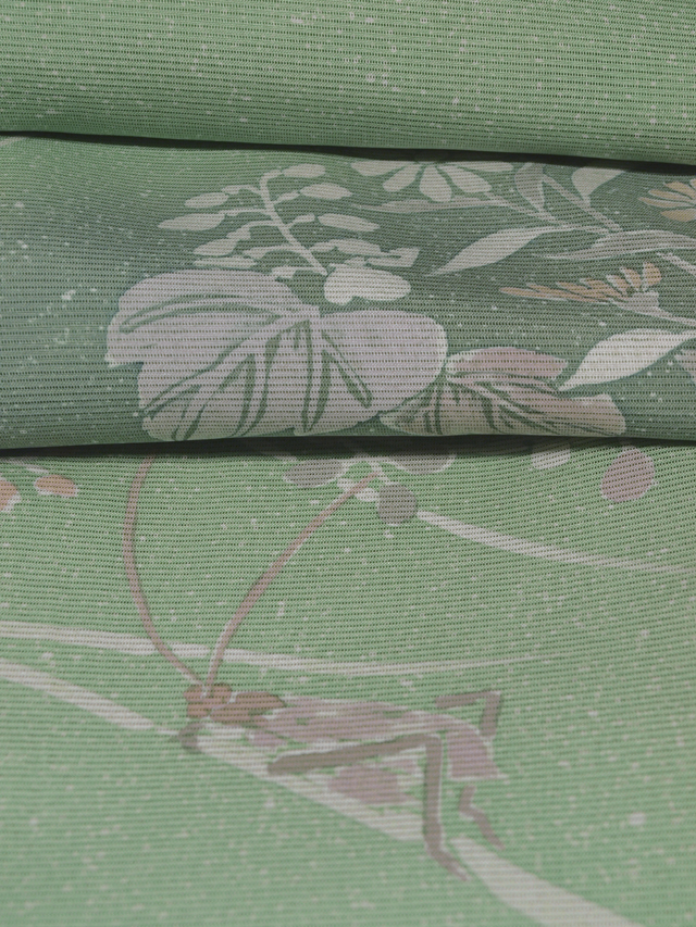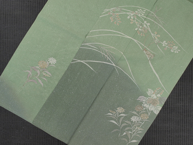 さらりとしてコシのある上質な絹絽地の訪問着です。 浅緑(あさみどり)色の濃淡で染められた地に、 萩や菊、ススキといった秋草と鈴虫の絵が 手描き染めであらわされています。 たたき染めによりあらわされた小さな氷の破片を思わせる白い点々と 水彩画のようなタッチの草花が涼やかで、気品が感じられます。 上前の裾に一匹のみあらわされた鈴虫の絵図からも品の良いかわいらしさが感じられます。 年令を問わないお色柄で、長く飽きずに重宝いただけるでしょう。 着用期間は6月下旬~9月上旬です。 ※色名は「日本の伝統色 和色大辞典」を参考にしています。 |