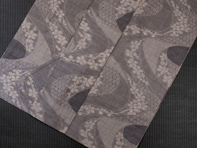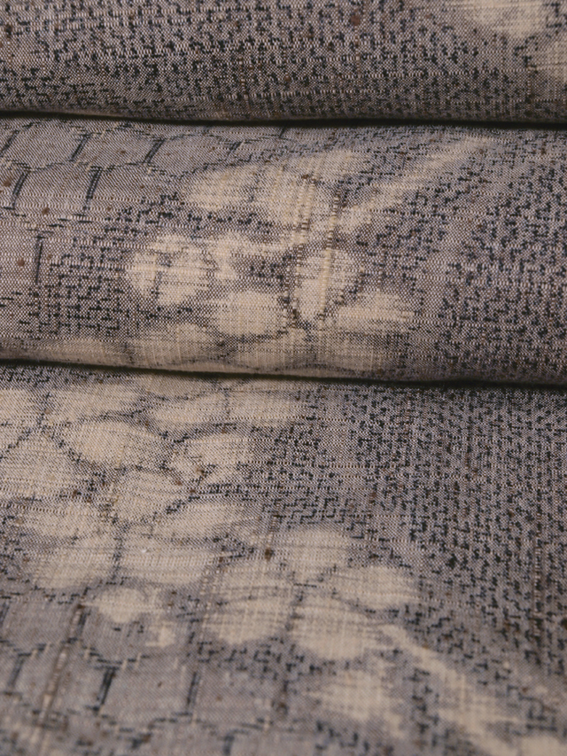 さらりとして張りのある真綿紬の単衣です。 紫鼠(むらさきねず)色の濃淡で、流水に亀甲や点などの小紋柄と、抽象的な花文様が織りあらわされています。 所々に花文様の配された流水が優雅な趣きで、 品の良いかわいらしさが感じられます。 ぜんまい紬のような茶色の節が素朴な織り味です。 シックな色合いが小粋で、さまざまな場面でお楽しみいただけるでしょう。 ●お薦めのシーン : 観劇や美術鑑賞、ご友人とのお食事やお買いもの、お稽古、近所にお散歩など ●お薦めの季節 : 初秋~秋、初夏 ※色名は「日本の伝統色 和色大辞典」を参考にしています。 |