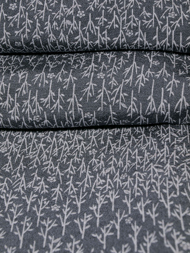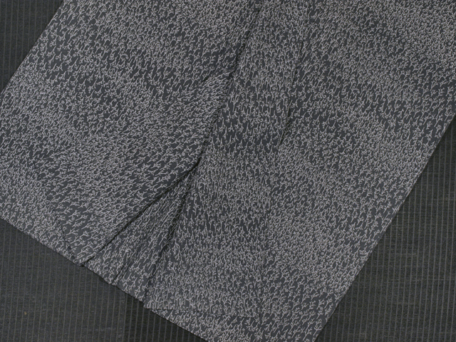 墨色地の地全体に、白色で抽象的な小枝と小花文様が型染めであらわされています。 和洋折衷で抽象的な小枝と小花文様の意匠からは、 品の良いかわいらしさとモダンな趣きが感じられます。 連続的で細かな意匠は、江戸小紋のように無地感覚でさまざま帯を引き立てていただけそうで、年令を問わず長く重宝いただけるでしょう。 八掛けは共八掛けです。 ●お薦めのシーン : 観劇や美術鑑賞、気さくなパーティー、お茶席、ご友人とのお食事やお買いもの、お稽古、近所にお散歩など ●お薦めの季節 : 春秋冬 ※色名は「日本の伝統色 和色大辞典」を参考にしています。 |