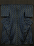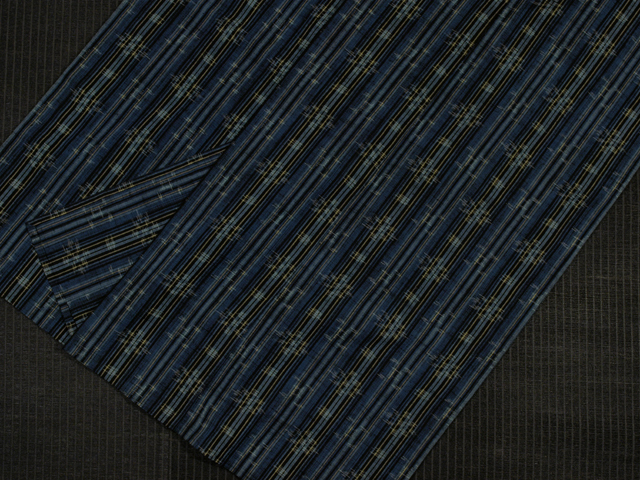 さらりとして張りのある軽い紬の単衣です。 鈍い光沢をもつ濃藍色の地に、縦縞に幾何学的な花文様が織り出されています。 すっきりとしたラインで織り出された縦縞と、抽象的な花の絣文様との組み合わせが美しく、不均一な輪郭線が意匠に奥行きをもたらしています。 鉄紺色から藍色のグラデーションで織り出された地に、黒色と黄色の縞といった すっきりとした色合いもモダンで洒落た趣きです。 さまざまな帯を引き立てていただけそうなお色柄で長くご愛用いただけるでしょう。 ●お薦めのシーン : 観劇や美術鑑賞、ご友人とのお食事やお買いもの、お稽古、近所にお散歩など ●お薦めの季節 : 5月上旬~6月下旬、 9月上旬~11月上旬 ※色名は「日本の伝統色 和色大辞典」を参考にしています。 |