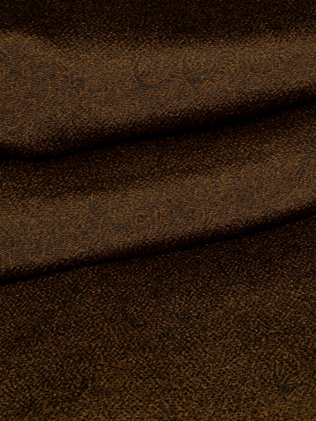 平等院鳳凰と唐草文様が丹念な染めで連続的にあらわされています。 格調の高い意匠を精緻に表現した型紙は、人間国宝の中村勇二郎氏の作品を思わせ、 高度な技術力がうかがえます。 凹凸のある縮緬に美しく染められた意匠は陰影があり、重厚感が感じられます。 黒色の地に茶褐色の文様といった色合いも気品がありモダンな趣きで、 年末年始などのお出かけにも重宝いただけるでしょう。 ※八掛けは灰茶色の無地です。 ●お薦めのシーン : 観劇や美術鑑賞、茶事、気さくなパーティ、ご友人とのお食事やお買いもの、お稽古、近所にお散歩など ●お薦めの季節 : 春秋冬 ※色名は「日本の伝統色 和色大辞典」を参考にしています。 |