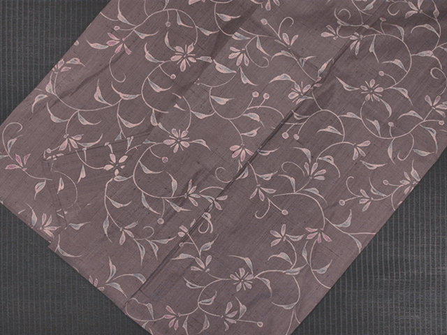 梅鼠色色の地に、唐花文様が型染めであらわされています。 ゆるやかな曲線であらわされた唐花文様からは 女性らしいやさしさが感じられます。 生紬のような太い節のある紬地があじわい深く、 唐花文様を引き立てています。 梅鼠色の地に、藤紫色や京紫色といった色合いも美しく、 品の良い華やかさが感じられます。 さまざまな帯合わせをお楽しみいただけそうなお色柄で、 いろいろな場面でご活用いただけるでしょう。 ※色名は「日本の伝統色 和色大辞典」を参考にしています。 ●お薦めのシーン : 観劇や美術鑑賞、お稽古、ご友人とのお食事やお買いもの ●お薦めの季節 : 9月~10月下旬、5月~6月下旬ぐらい ※色名は「日本の伝統色 和色大辞典」を参考にしています。 |