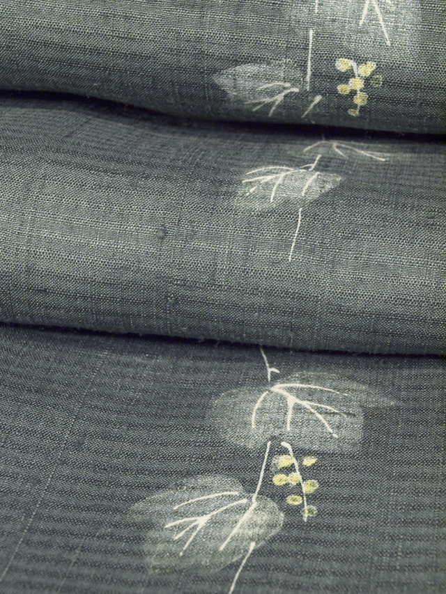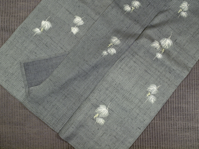 さらりとして張りのある上質な生紬地の単衣の着物です。 「生紬」は、座繰りで丹念に引き出された玉繭をセリシンを残して精錬した「生糸」を用いて織り上げられた紬です。 その風合いはシャリ感と張りがあり 軽やかな着心地で、着るたびに肌に心地よく馴染んできます。 こちらは錆鼠色の地に、蔦と小さな木の実の絵図が手描き染めされた生紬の小紋です。 絵筆でさらりと描いたようなラフなタッチの意匠からは品の良いかわいらしさが感じられます。 自然布のようなざっくりとした風合いと、錆鼠色地に淡黄色と白色のみのシンプルなお色目もモダンで洒落た趣きです。 さまざまな帯をを引き立てていただけそうなお色柄で、長くご愛用いただけるでしょう。 ※裾除けが付いています。 ●お薦めのシーン : 観劇や美術鑑賞、ご友人とのお食事やお買いもの、お稽古、近所にお散歩など ●お薦めの季節 : 5月上旬~6月下旬、 9月上旬~11月上旬 ※色名は「日本の伝統色 和色大辞典」を参考にしています。 |