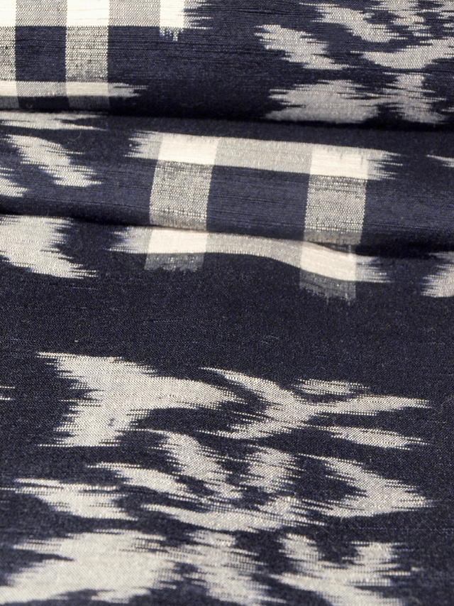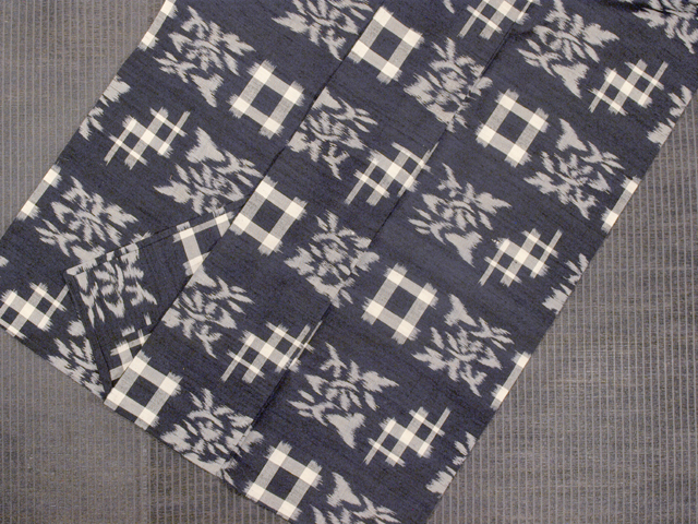 濃藍色の地に、白色で井桁絣と抽象的な鳥花文様が織り出されています。 綿絣を思わせる大きめな絣文様が珍しく、濃藍色の地に白色の絣織りがきりりと映え、目を引きます。 真綿紬ならではの節のある紬地と鈍い光沢をもつ風合いが意匠を引き立てて、 奥行きが感じられます。 深みのある濃藍色地も美しく、さまざまな帯合わせをお楽しみいただけるでしょう。 ●お薦めのシーン : 観劇や美術鑑賞、ご友人とのお食事やお買いもの、お稽古、近所にお散歩など ●お薦めの季節 : 5月上旬~6月下旬、 9月上旬~11月上旬 ※色名は「日本の伝統色 和色大辞典」を参考にしています。 |