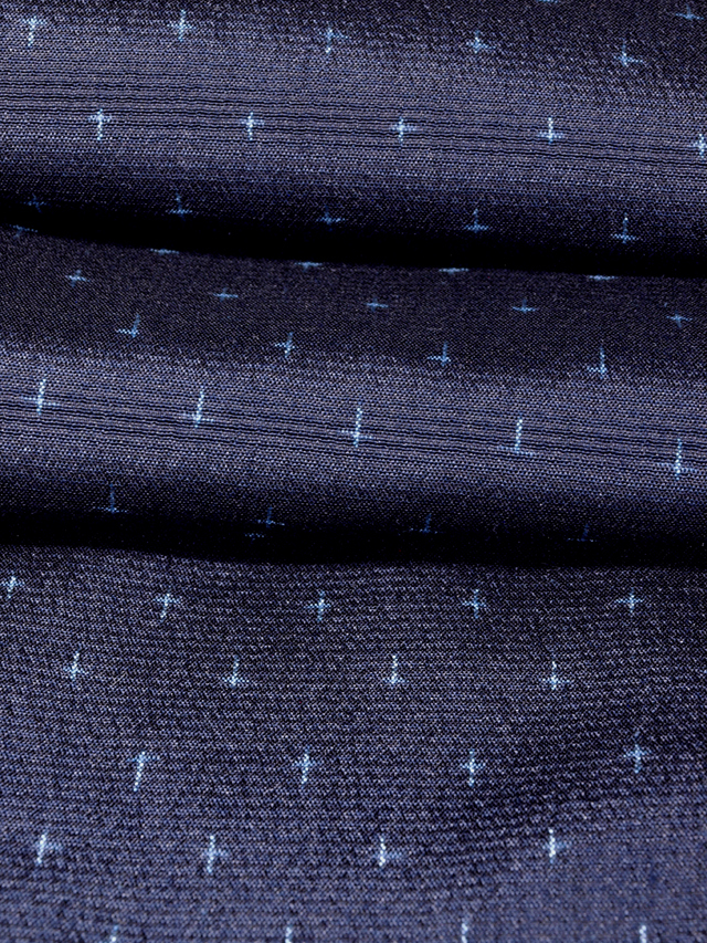 上質な絹織物の産地として知られる新潟県の塩沢地方で織り上げられた塩沢お召しの単衣です。 塩沢お召しは、緯糸(よこいと)に強い撚りを掛けた生糸を用いることで生地に細かな「シボ」を生じさせた先染めの絹織物です。 さらりとした肌触りと上質な絹糸の風合いは昔から評判が良く、江戸時代のころには献上品としても織られていました。 こちらは濃藍色の地に淡藤色の糸で蚊絣文様が織り出された塩沢お召しです。 塩沢お召しならではのシボの凹凸がシンプルな意匠に奥行きをもたらしていて、高級感が漂います。 さまざま帯が合わせやすく、飽きのこないお色柄で長く飽きずに重宝いただけるでしょう。 ※裾除けが付いています。 ●お薦めのシーン : 観劇や美術鑑賞、気さくなパーティ、ご友人とのお食事やお買いもの、お稽古、近所にお散歩など ●お薦めの季節 : 5月上旬~6月下旬、 9月上旬~11月上旬 ※色名は「日本の伝統色 和色大辞典」を参考にしています。 |