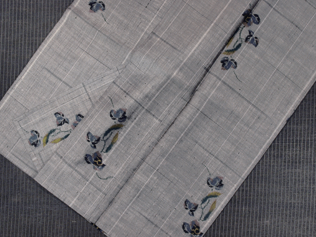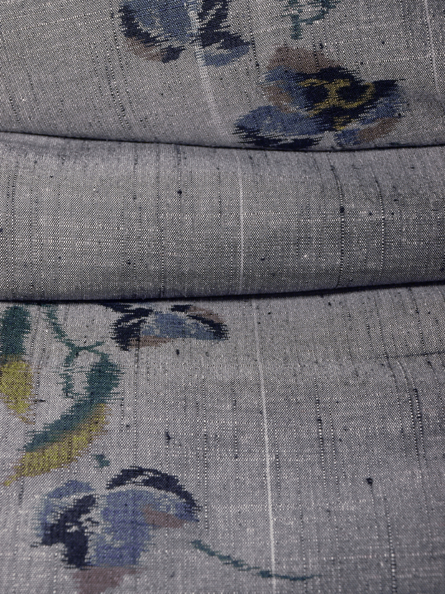 さらりとして、張りのある紬地の単衣です。 途切れ格子縞に、糸瓜(へちま)の絵図が所々に配されています。 蔓を伸ばす糸瓜は古来よりその生命力から長寿や繁栄をあらわす吉祥文様として用いられてきました。 格子縞を背景に配された糸瓜の意匠からは支柱に蔦をからめて伸びる糸瓜の瑞々しさとかわいらしさが感じられます。 鈍い光沢感をもつ銀鼠色の地もモダンで粋な趣きです。 さらりと軽い紬の風合いも良く、帯合わせをお楽しみいただけそうなお色柄で、いろいろな場面で重宝いただけるでしょう。 ●お薦めのシーン : 観劇や美術鑑賞、ご友人とのお食事やお買いもの、お稽古、近所にお散歩など ●お薦めの季節 : 5月上旬~6月下旬、 9月上旬~11月上旬 ※色名は「日本の伝統色 和色大辞典」を参考にしています。 ●お薦めのシーン : 観劇や美術鑑賞、ご友人とのお食事やお買いもの、お稽古、近所にお散歩など ●お薦めの季節 : 4月上旬~6月上旬、 9月下旬~11月下旬 ※色名は「日本の伝統色 和色大辞典」を参考にしています。 |
