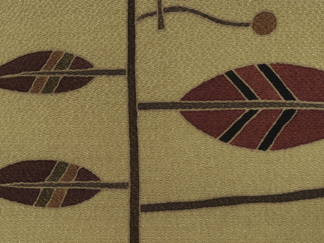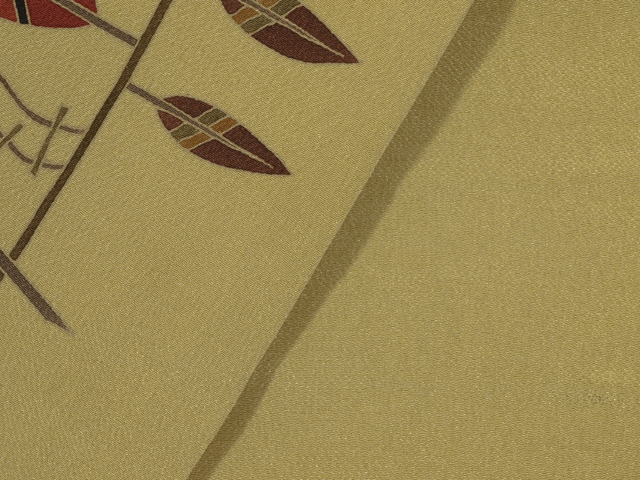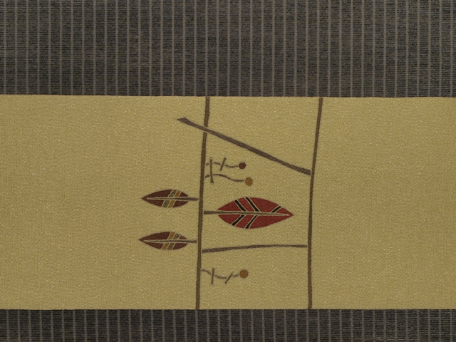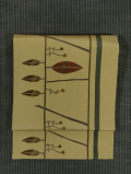 名古屋帯にお仕立て直ししました。 利休茶(りきゅうちゃ)色の地に、縞に枝葉文様が手描き友禅で染めあらわされています。 アールデコ調に意匠化された枝葉の文様からは幾何学的な面白味と洒落た雰囲気が漂います。 利休茶色の地に、深緑色のラインがすっきりとした印象で、 鳶紫色や苔色、芥子色といった落ち着いた色合いがモダンに意匠を引き立てています。 さり気なく小粋なお色柄はさまざまなお着物にあわせやすく、長く飽きずに重宝いただけるでしょう。 ○前巾は通常の4寸1分(15.6cm)より少し広めの「巾替え」仕立ての名古屋帯です。 ●お薦めのシーン : 美術鑑賞、観劇、ご友人とのお食事やお買いもの、お稽古、近所にお散歩など ●お薦めの季節 : 春秋冬 ※色名は「日本の伝統色 和色大辞典」を参考にしています。 |