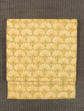 さらりとしてしなやかなコシをもつ中厚手の絹縮緬を洗い張りして、名古屋帯にお仕立て替えしました。 鶯色(うぐいすいろ)の地に、横菊文様が型染めであらわされています。 規則正しく並べられた横菊の意匠はアールデコ調の幾何学的な面白味があり、 和洋折衷で洒落た雰囲気が漂います。 線画のような細い輪郭線や、ランダムな花びらの染め具合からは手仕事のようなあたたかみが感じられます。 地に織り出された小花文様が光の加減で浮き沈みする様も品があり、 やわらかな鶯色の地に、白茶色のみのシンプルな色付けがモダンな趣きです。 抽象的な横菊の意匠なので季節を問わず、さまざまなお着物に合わせていろいろな場面で重宝いただけるでしょう。 ◆ こちらのお品はInstagramでもご紹介しております。 ●お薦めのシーン : 美術鑑賞、観劇、ご友人とのお食事やお買いもの、お稽古、近所にお散歩など ●お薦めの季節 : 春秋冬 ※色名は「日本の伝統色 和色大辞典」を参考にしています。 |