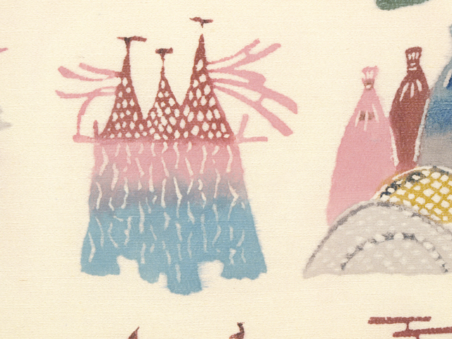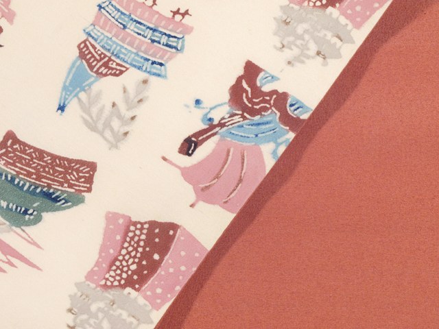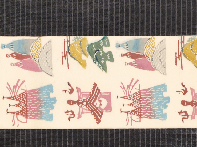 さらりとして張りをもつ中厚手の紬縮緬の帯を洗い張りして、名古屋帯にお仕立て直ししました。 白色の地に、舟に網干、橋といった水辺にまつわる文様が紅型染めであらわされています。 波に帆船、柳に橋、霞に山並みといったさまざまな絵柄をバランスよく配した絵図からは、 作り手のデザイン力の高さと粋な遊び心が感じられます。 生成り色の地にたれの真赭(まそほ)色の組み合わせが美しく、水色や緑色、栗色、退紅(あらぞめ)色、といった爽やかですっきりとした色合いは遠目から眺めても美しく映えます。 節のある紬縮緬の風合いも良く、さまざまなお着物に合わせやすいお色柄で、季節を問わず重宝いただけるでしょう。 たれと裏地は真赭(まそほ)色の無地です。 ●お薦めのシーン : 観劇や美術鑑賞、ご友人とのお食事やお買いもの、お稽古、近所にお散歩など ●お薦めの季節 : 春秋冬 ※色名は「日本の伝統色 和色大辞典」を参考にしています。 |
