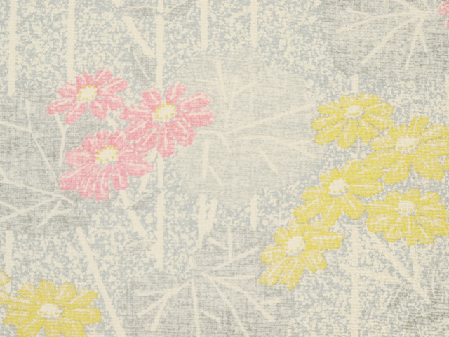 さらりとして張りのある絹縮緬を洗い張りして名古屋帯にお仕立て替えしました。 たたき染めされた銀鼠色の地に、石蕗(つわぶき)の絵図が型染めであらわされています。 寒い冬にも緑色の大きな葉を茂らす常緑の石蕗は昔から縁起の良い植物とされてきました。 パステルやペンシルなどで描いたように表現された葉っぱと花の絵図からは陰日陰で咲く石蕗(つわぶき)のかわいらしさと生命力が感じられます。 鼠色の濃淡といったモノトーンに淡黄色や薄紅色に染められた花といったやさしい色使いもモダンで洒落た雰囲気です。 品の良いかわいらしさが感じられる型染めの帯は紬や小紋などざまざまなお着物に映えそうで、 いろいろな場面で重宝いただけるでしょう。 ●お薦めのシーン : 観劇や美術鑑賞、ご友人とのお食事やお買いもの、お稽古、近所にお散歩など ●お薦めの季節 : 春秋冬 ※色名は「日本の伝統色 和色大辞典」を参考にしています。 |
